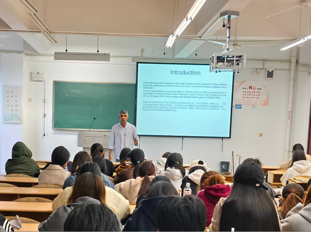 11月12日,数字经贸学院特邀温州大学商学院外籍教师Uddin老师,为大数据与会计专业学生带来“俄罗斯与中华人民共和国的跨境贸易关系(原油)”专题讲座,以国际视野搭建理论与实务桥梁。 讲座中,Uddin老师聚焦中俄原油贸易核心,详解两国能源合作政策、交易流程、结算机制及关税税务处理,重点解读人民币跨境结算应用趋势,并结合专业特性,分享大数据工具在贸易财务核算、风险预判中的实践路径。现场互动热烈,学生围绕跨境贸易会计难点、大数据应用等问题积极提问,Uddin老师结合案例答疑。学生纷纷表示,讲座兼具前沿性与实用性,明确了专业与数字技术、跨境贸易的融合方向,填补了课堂与行业实践的衔接空白;学院教师也认为讲座为专业教学提供了国际化视角。