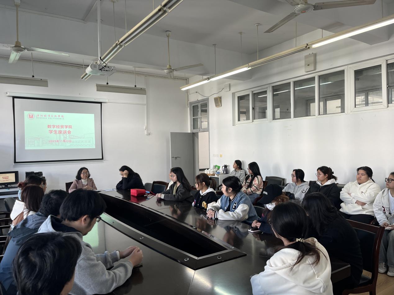 11月20日中午,数字经贸学院在茶山校区崇学楼404召开学生期中座谈会。会议由副院长王赛芝主持,院办、学工办代表以及23级、24级和25级各班学生代表出席本次座谈会。